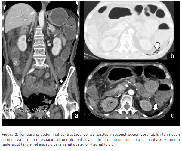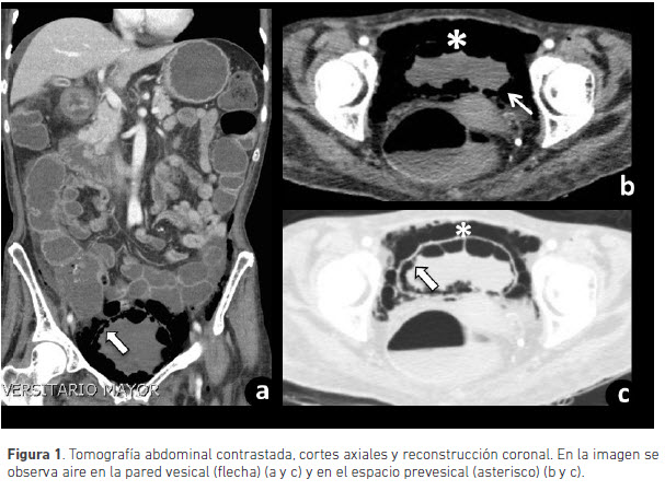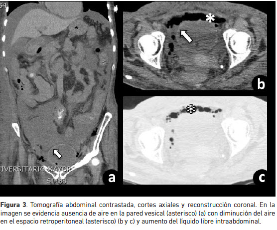 La cistitis enfisematosa es la presencia de gas en la pared vesical, secundaria a colonización por microorganismos formadores de gas (3), mientras que el retroneumoperitoneo es la presencia de gas en el espacio retroperitoneal (4).