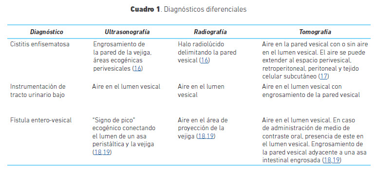 Las alteraciones en la radiografía simple de abdomen incluyen un halo radiolúcido que delimita la pared vesical con o sin aire, en el área de proyección de la vejiga. La tomografía computarizada permite realizar el diagnóstico diferencial, logra una mayor caracterización de la distribución y extensión del aire. En ésta se identifican burbujas de aire en la pared vesical, el cual se puede extender al espacio perivesical, retroperitoneal, intraperitoneal y a tejido celular subcutáneo. Sólo se conoce de dos casos reportados con extensión del aire al espacio retroperitoneal (1,2).