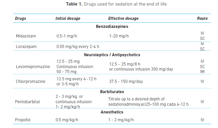 Patients can be receiving opioids as an analgesic treatment or as a therapy for dyspnea; these drugs can produce sedation as a side effect but they should never be used for this only purpose (18). Table 1 below shows the drugs with their dosages and routes of administration.