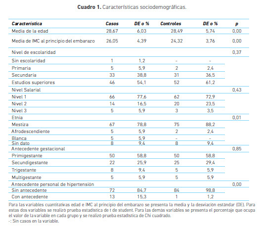 Se obtuvieron 770 pacientes con diagnósticos relacionados con síndrome hipertensivo asociado al embarazo, 164 tuvieron criterios clínicos para preeclampsia y 85 cumplieron los criterios de inclusión. El apareamiento de casos y controles se logró en un 100 % por edad, en un 98,8 % por antecedentes gineco-obstétricos y en un 90,6 % según índice de masa corporal al principio del embarazo.