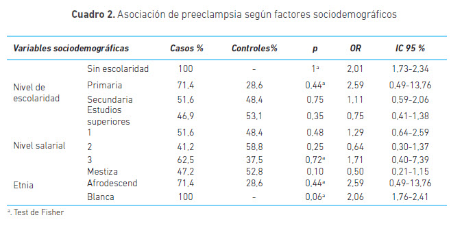 En el análisis bivariado, inicialmente se cruzaron las variables sociodemográficas con la preeclampsia (cuadro 2). Se omitieron las variables de edad, índice de masa corporal al principio del embarazo y antecedentes gineco-obstétricos, ya que estaban controladas mediante apareamiento.