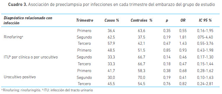 En un análisis inicial de los procesos infecciosos en el embarazo y en el cual no se discriminó el trimestre en que se presentaron, se obtuvo para urocultivo positivo un OR de 0,65 (IC95 %= 0,31-1,38), para ITU diagnosticada por clínica o urocultivo un OR 0,63 (0,33-1,23) y para rinofaringitis de 1,49 (0,77-2,92). Posteriormente se procedió a realizar el análisis por trimestre del embarazo (cuadro 3).
