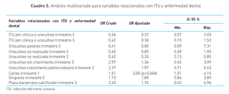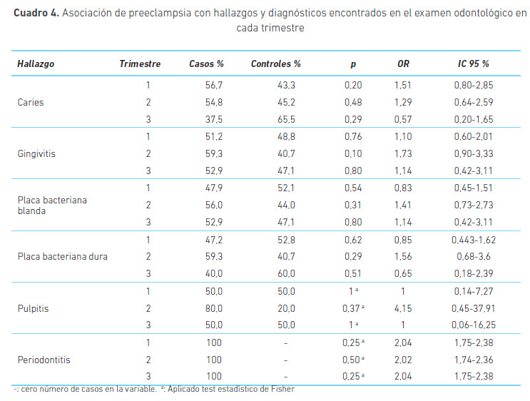 Puede entonces considerarse que la caries en el primer trimestre, junto con la presentación de otros hallazgos dentales y de infecciones urinarias puede estar asociada con preeclampsia. Poca evidencia hay en la literatura al respecto: un estudio realizado por Khader et al. con 115 mujeres con preeclampsia y 230 controles también encuentra dicha asociación, OR 1,15 (IC 95 %= 1,05-1,25) en el análisis bivariado y OR 1,14 (IC 95 %= 1,03-1,27) en el análisis multivariado, en el que se incluyeron factores asociados como la edad, nuliparidad y el índice de masa corporal al principio del embarazo (19).
