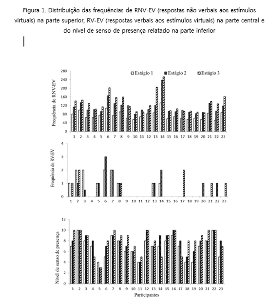 distribuição, por participantes, das frequências de RNV–EV, na parte central, a distribuição de RV–EV e na parte inferior, a distribuição do nível de senso de presença relatado durante a fase do jogo filmada. Verifica–se na parte superior dessa figura que 19 dos 23 participantes apresentaram um aumento gradual na frequência de RNV–EV, à medida que avançaram do Estágio 1 para o Estágio 3 e que todos os participantes apresentaram uma frequência maior de RNV–EV no Estágio 3 do que no Estágio 1.