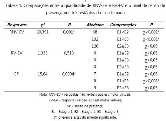 As frequências de RNV–EV e de RV–EV e os níveis de senso de presença observados em cada um dos três estágios da fase filmada foram comparados por meio do Teste de Friedman, cujos resultados encontram–se na Tabela 1. Para as diferenças estatisticamente significantes, foi feita a comparação entre pares, a partir do teste de Dunn. Observa–se nesta tabela que a diferença entre o Estágio 1 e o Estágio 2 é estatisticamente significante para as RNV–EV. Essas respostas foram emitidas com frequência maior no Estágio 2, quando comparado ao Estágio 1, e com frequência maior no Estágio 3 do que no Estágio 1. Com relação às RV–EV, não foi encontrada diferença significante entre os estágios. Quanto aos níveis de presença relatados, verifica–se diferença estatisticamente significante entre o Estágio 1 e o Estágio 3, sendo maior no Estágio 3. Quando o índice de Correlação de Spearman foi calculado para verificar se houve correlação entre RNV–EV e senso de presença, e entre RV–EV e senso de presença (Tabela 2, parte superior), não foram encontradas essas correlações.