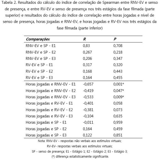 Na parte inferior da Tabela 2 estão os índices de Correlações de Spearman obtidos da comparação entre horas jogadas pelo participante semanalmente e as respostas registradas ao longo do jogo nos três estágios da fase filmada, podendo–se verificar que houve: a) presença de correlação negativa entre a quantidade de horas jogadas semanalmente e as RNV–EV dos três estágios; b) tendência de correlação negativa entre RV–EV apresentadas nos Estágios 1 e 2 e a quantidade de horas jogadas semanalmente; e c) ausência de correlação entre os relatos de senso de presença nos três estágios e a quantidade de horas jogadas semanalmente. Com relação à experiência com computador (avançada, intermediária e baixa) relatada, calculou–se a média do nível de senso de presença relatado pelos participantes no Estágio 3 e verificou–se que os que informaram ter experiência avançada (n=2) com computares relataram média maior (9,0) do que os que informaram experiência intermediária (n=11), cuja média foi 8,1, sendo essa média maior do que a dos que relataram experiência básica (n=10; média 7,7).