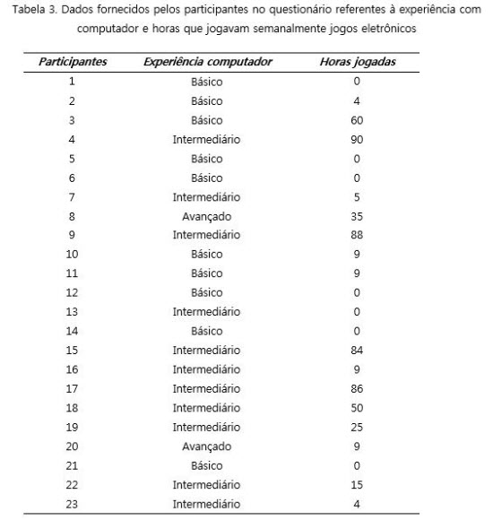 Os dados obtidos no questionário (experiência do participante com computador e horas que joga semanalmente) estão distribuídos na Tabela 3. Ao se compararem esses dados com o nível de senso de presença relatado pelos participantes (escala de 1 a 10), verifica–se que dentre os participantes que responderam ter experiência básica (Participantes 1, 2, 3, 5, 6, 10, 11, 12, 14, e 21), quatro deles (Participantes 5, 6, 10 e 11) relataram níveis de presença igual ou menor que seis em mais de um estágio e cinco deles (Participantes 1, 2, 3, 12 e 21) relataram níveis de presença igual ou maior que oito em mais de um estágio. Dentre os participantes que possuíam nível intermediário de experiência (Participantes 4, 7, 9, 13, 15, 16, 17, 18, 19, 22 e 23), dois deles (Participantes 18 e 19) relataram níveis de senso de presença igual ou menor que seis em mais de um estágio e quatro (Participantes 7, 15, 16 e 22) relataram níveis de senso de presença igual ou maior que oito em mais de um estágio. Os participantes que informaram ter nível avançado de experiência (Participante 8 e 20) relataram níveis igual ou superior a oito em pelo menos dois estágios.