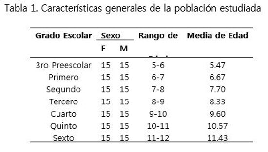 ESe seleccionaron 210 niños, pertenecientes a escuelas oficiales de la zona urbana del Estado de Puebla–México. 15 niñas y 15 niños en cada uno de los grados de tercero de preescolar a sexto grado de primaria (Tabla 1).
