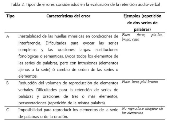 De igual manera, los resultados de la presente investigación han permitido identificar lo errores típicos en la tareas de retención audio verbal que comenten los niños de los grupos estudiados. Para las tareas de retención involuntaria y retención ante interferencia heterogénea el error más frecuente es el tipo B (reducción del volumen de reproducción de elementos verbales y dificultades para la retención de series de palabras), mientras que para las tareas de retención voluntaria y retención de oraciones el error más frecuente es el A (inestabilidad de las huellas mnésicas y dificultades para evocar las series y las oraciones, sustituciones fonológicas ó semánticas).