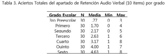 Durante la evaluación de la retención audio verbal se evidenció un aumento progresivo de la media de aciertos totales, las puntuaciones más altas se registraron en cuarto, quinto y sexto año (Ver Tabla 3).