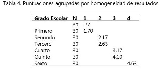 En la prueba ANOVA se observaron diferencias estadísticamente significativas (0.000) en los puntajes (número de aciertos) para cada grado escolar, lo cual indicó que el desempeño fue diferente para cada uno de los grados que componen esta investigación.
