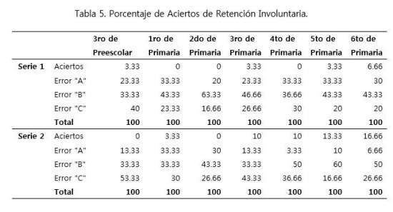 La Tabla 5 muestra el apartado retención involuntaria: repetición y evocación de dos series de palabras:“foco–duna–piel" /"bruma–gasa–luz". A pesar del incremento observado (acorde al grado escolar) el porcentaje de aciertos máximo es muy bajo 16.66%. De los cuatro apartados que conforman la evaluación de retención audio verbal, este fue el que obtuvo un menor número de respuestas correctas, por lo cual podemos señalar que el apartado de retención involuntaria es el que mayor complejidad presentó para los niños que integran esta muestra. Los errores de tipo C tienden a disminuir conforme avanza el grado escolar, no obstante, dicho error se encuentra presente en todos los grados escolares. El error que se presenta con mayor frecuencia es el tipo B, aunque es importante señalar que se observa una tendencia a disminuir en los últimos grados.