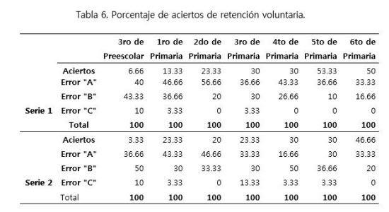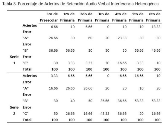 De acuerdo con los resultados de la presente investigación, es posible señalar que existen diferencias cuantitativas y cualitativas en la ejecución de tareas que evalúan la retención audio verbal entre los diversos grados escolares. Se presentó un incremento progresivo de aciertos desde tercero de preescolar hasta sexto grado de primaria, en todos