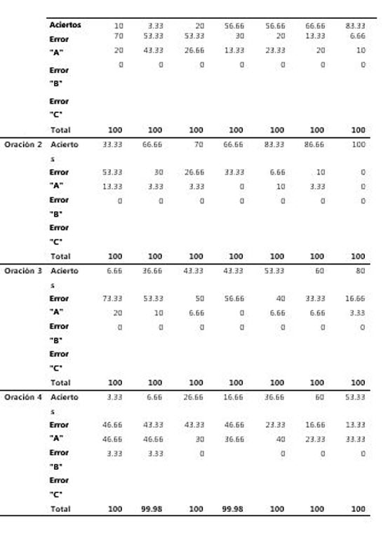 En la Tabla 6 se observa el número de aciertos para el apartado retención voluntaria, el cual lo conforman dos series (“foco – duna – piel"/"bruma – gasa – luz") (segunda repetición). El porcentaje de aciertos va en aumento conforme avanza el grado escolar. De igual manera, el número de respuestas correctas es mayor en relación a las obtenidas en el apartado de retención involuntaria. El error C disminuye considerablemente e incluso se observa como desaparece en los últimos grados (4to, 5to y 6to). En este apartado el error que se comete con mayor frecuencia es el A. La Tabla 7 muestra el apartado repetición de cuatro oraciones (4 ítems). El número de aciertos va en aumento conforme avanza el grado escolar, incluso en el 6to grado se presenta un 100% de aciertos para la oración 2. El error A es el que se presenta con mayor frecuencia pero este va decreciendo conforme aumenta el grado escolar. El error C no se presenta en los últimos grados. Esta es la tarea en la que se observa un mayor número de aciertos, por lo que podemos señalar que en comparación con los otros apartados que componen la evaluación este es el que tiene un menor nivel de complejidad.
